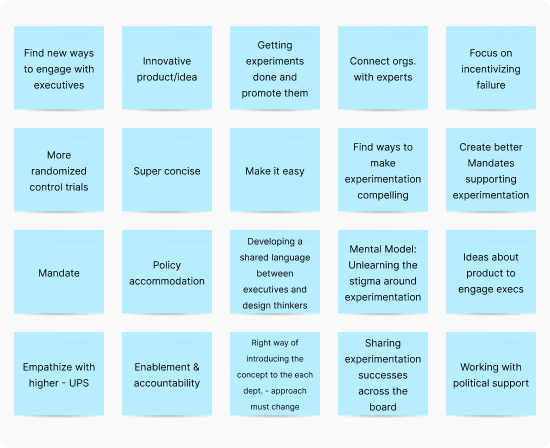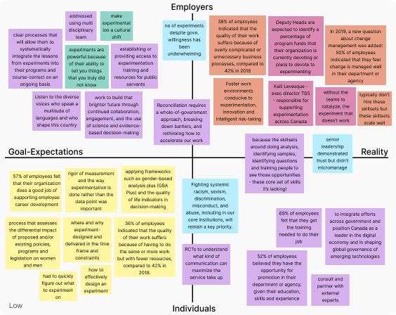 For this project, we engaged in rapid design research and synthesis, interviewing Canadian Government subject matter experts to understand the core process, their environment, and major tasks to accomplish. Through these interviews, we aimed to glean insights into their views on experimentation, understand the policy-making process, and pinpoint their pain points and needs.
