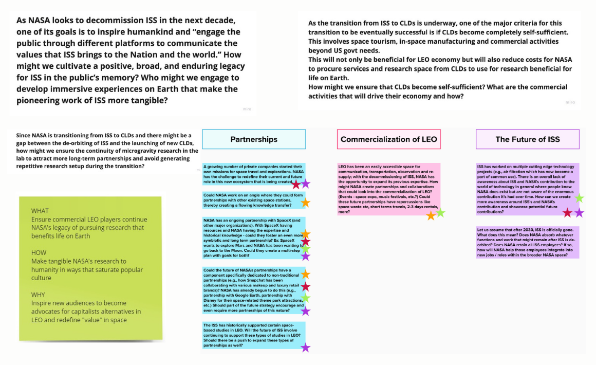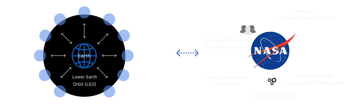 Following in-depth collaboration with the NASA team, we uncovered critical challenges and strategic opportunities to support the expansion of the Low Earth Orbit Economy. Using a design thinking framework, we carried out extensive research and analysis to deeply understand NASA’s future vision and long-term objectives.